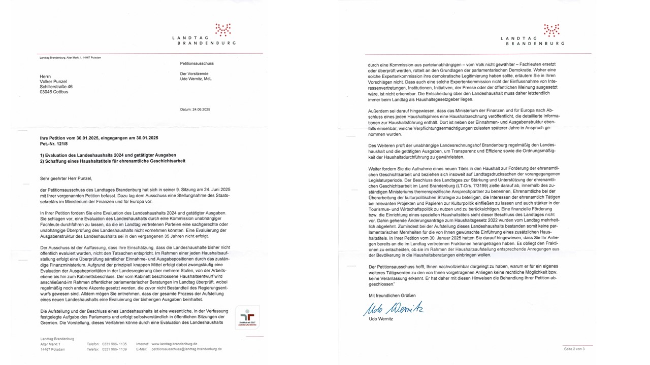 2. Wie der Vorsitzende des Petitionsausschusses, Udo Wernitz (SPD) den Petenten mit Schreiben vom 24.06.2025 (!!) wissen ließ, sehe der Ausschuss keine "rechtliche Möglichkeit" und "keine Veranlassung ", tätig zu werden. Aus der Länge der Antwort und den darin enthaltenen Allgemeinplätzen geht jedoch hervor, dass mit der Petition echte Probleme in der Haushaltsgesetzgebung Brandenburgs aufgedeckt wurden. Beleg dafür ist das Nichteingehen auf die rund 11 Millionen Euro, deren Sinnhaftigkeit sich nicht erschließt.