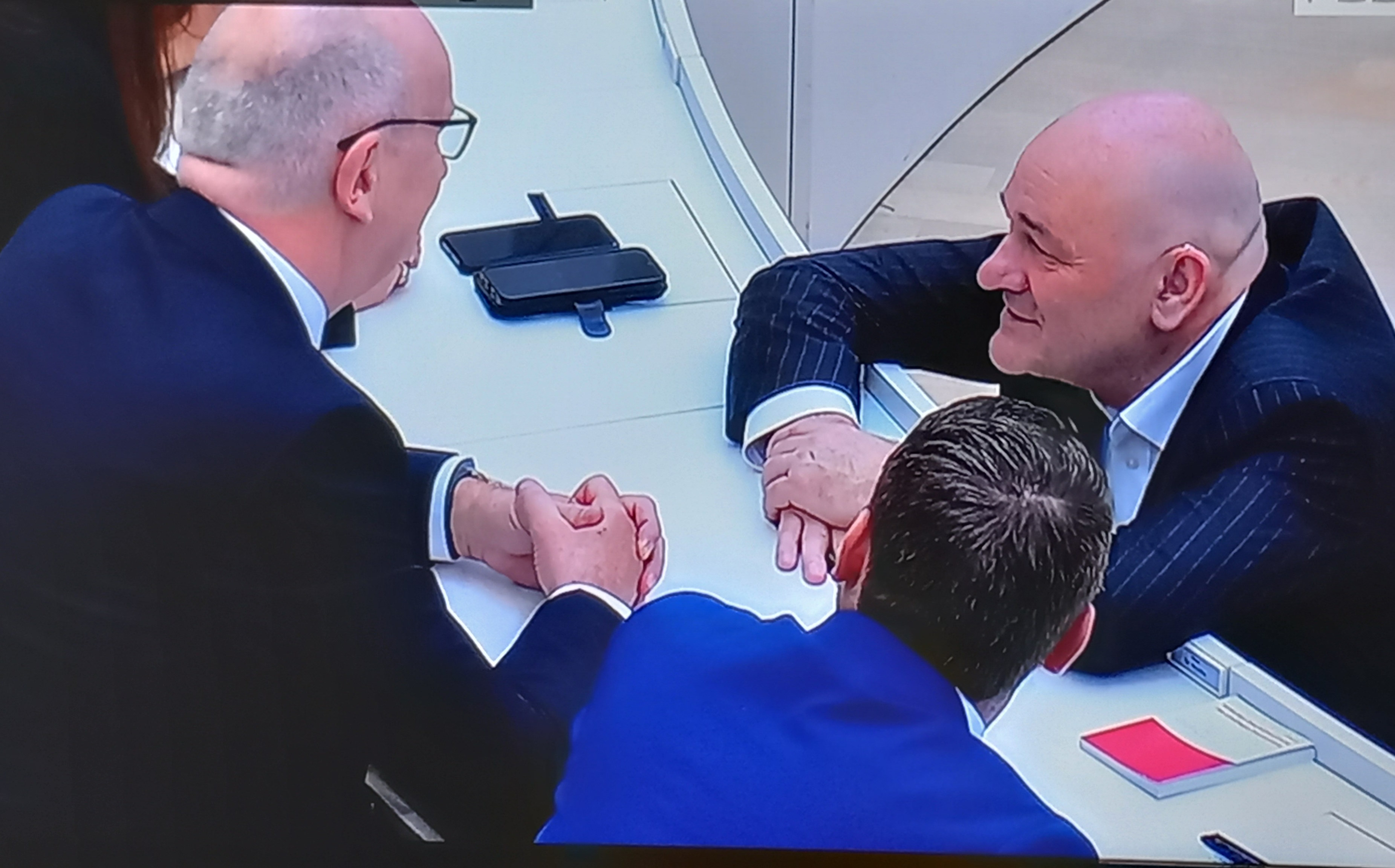 Dietmar Woidke (SPD) und Robert Crumbach (BSW) im Gespräch nach dem ersten, nicht erfolgreichen Wahlgang. (Quelle: RBB, Foto: GMP)